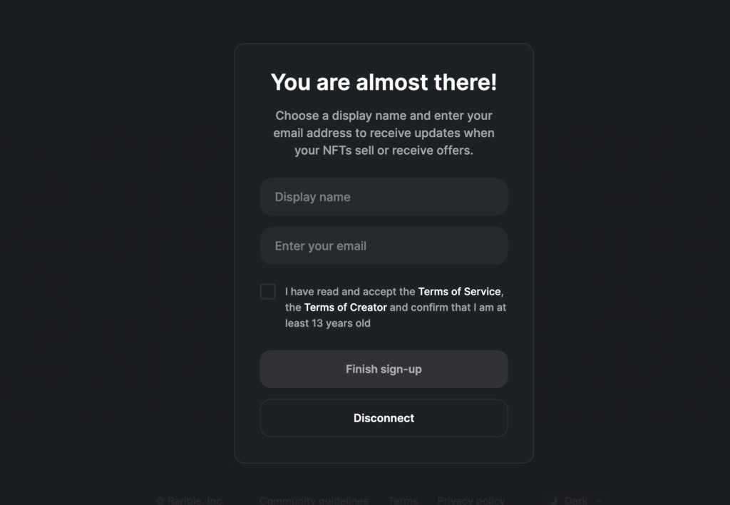 Then you will be prompted to select the name you wish to display (which people would see when you buy an NFT), and the email address you wish to use. The next step is to read & accept the terms and conditions, and press "Finish Sign Up".